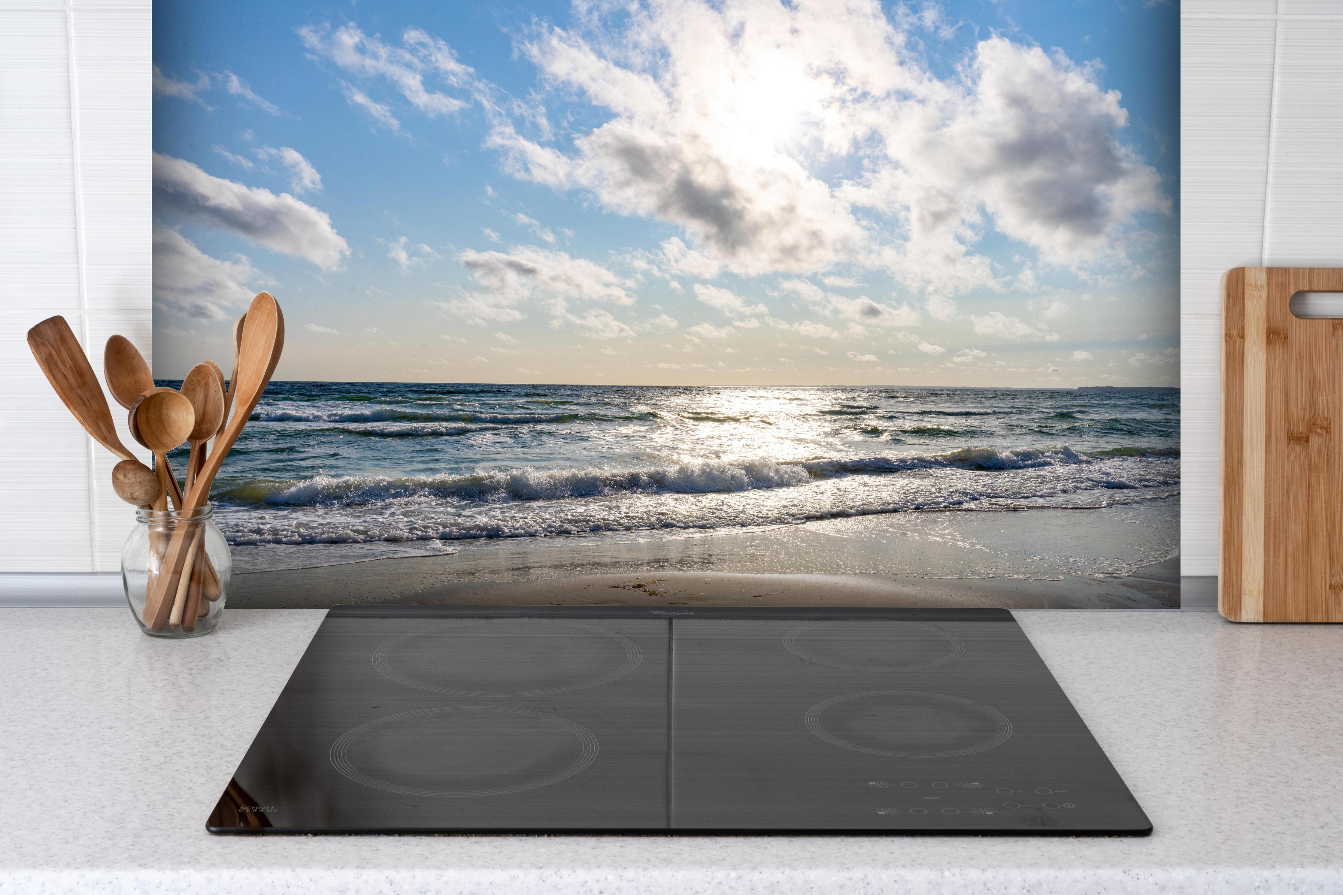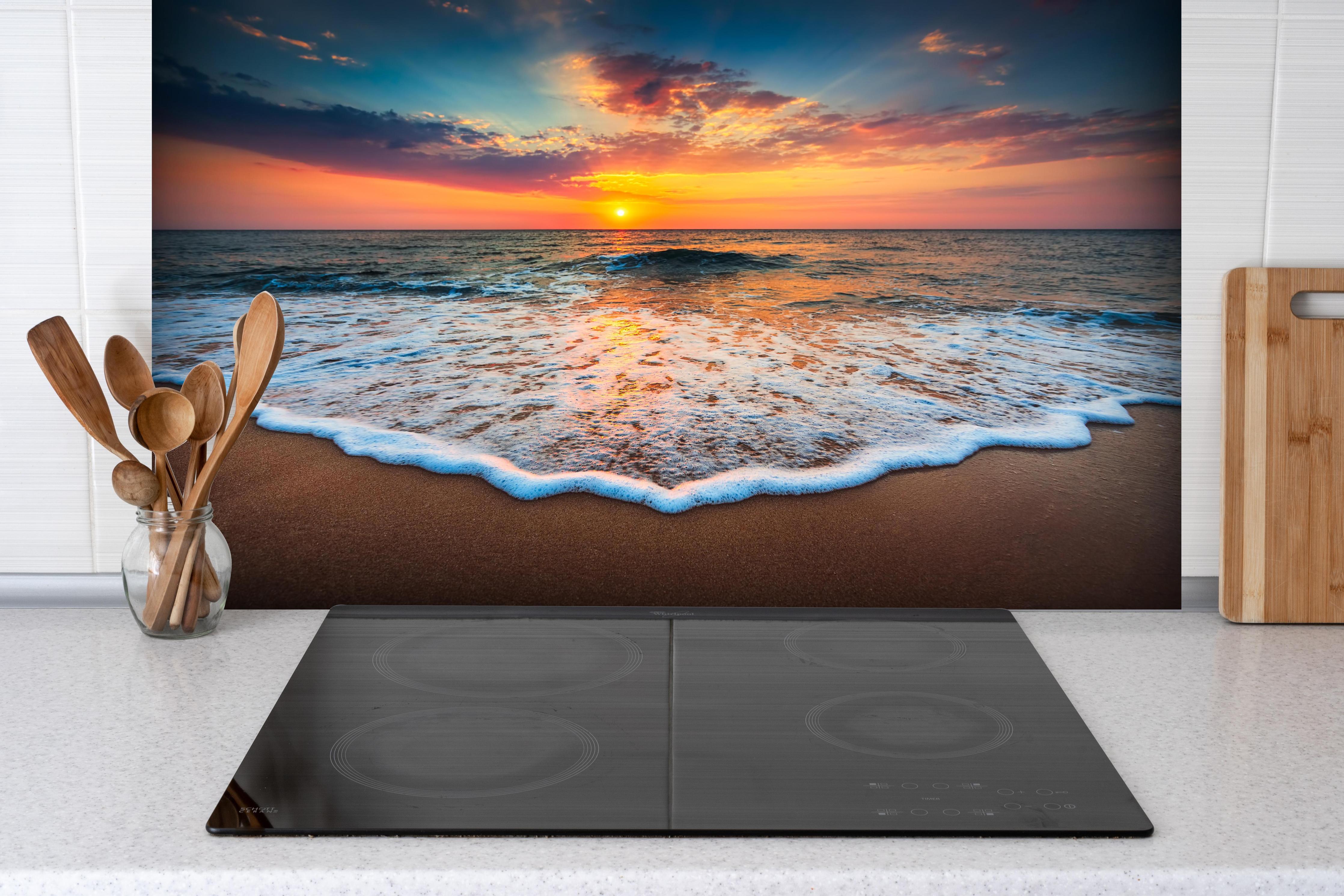 Spritzschutz-Beeindruckender Sonnenaufgang über dem OzeanSpritzschutz - Beeindruckender Sonnenaufgang über dem Ozean hinter einem Cerankochfeld zwischen Holz-Kochutensilien