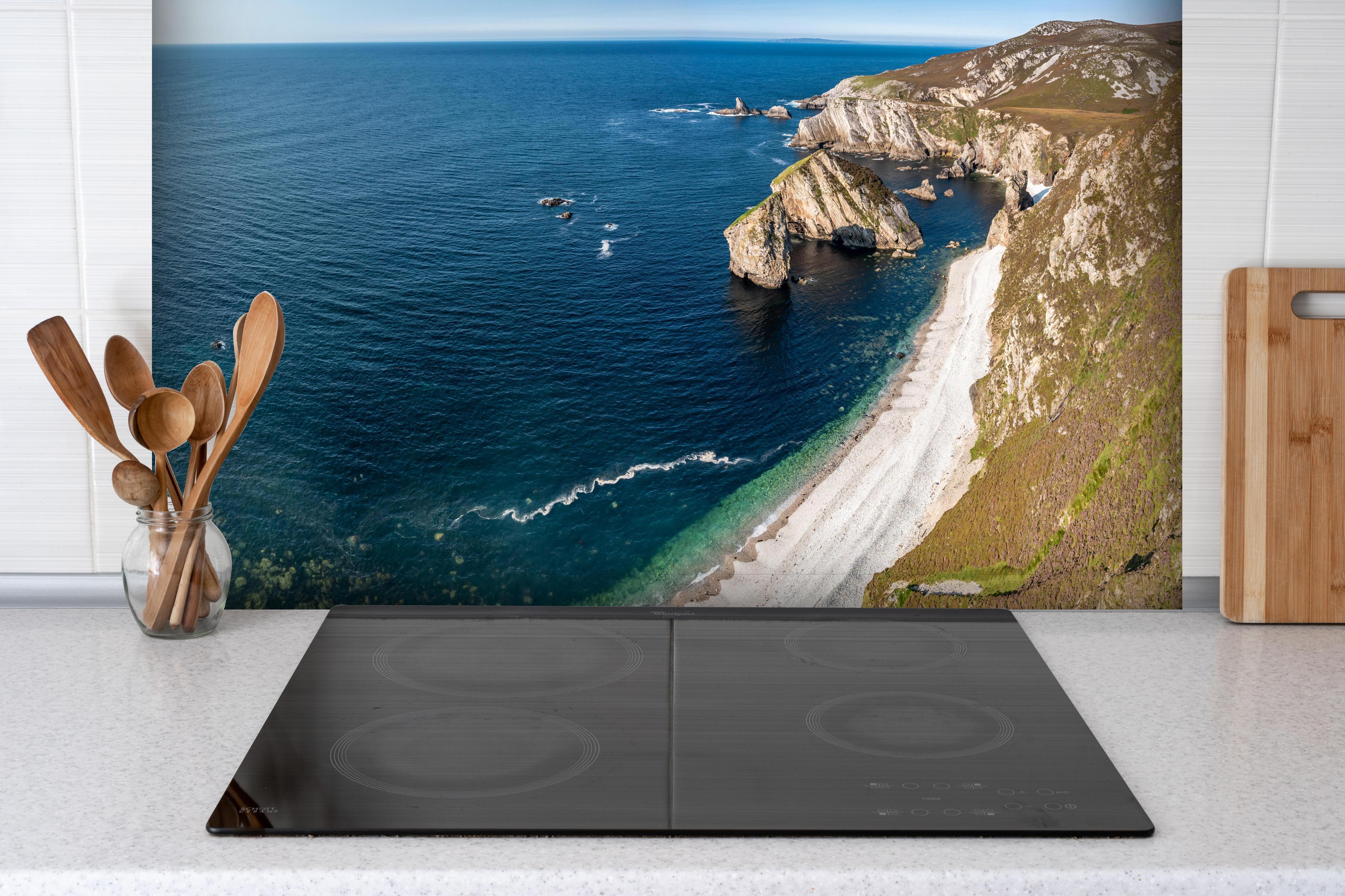 Spritzschutz-Die Bucht GlenloughSpritzschutz - Die Bucht Glenlough hinter einem Cerankochfeld zwischen Holz-Kochutensilien