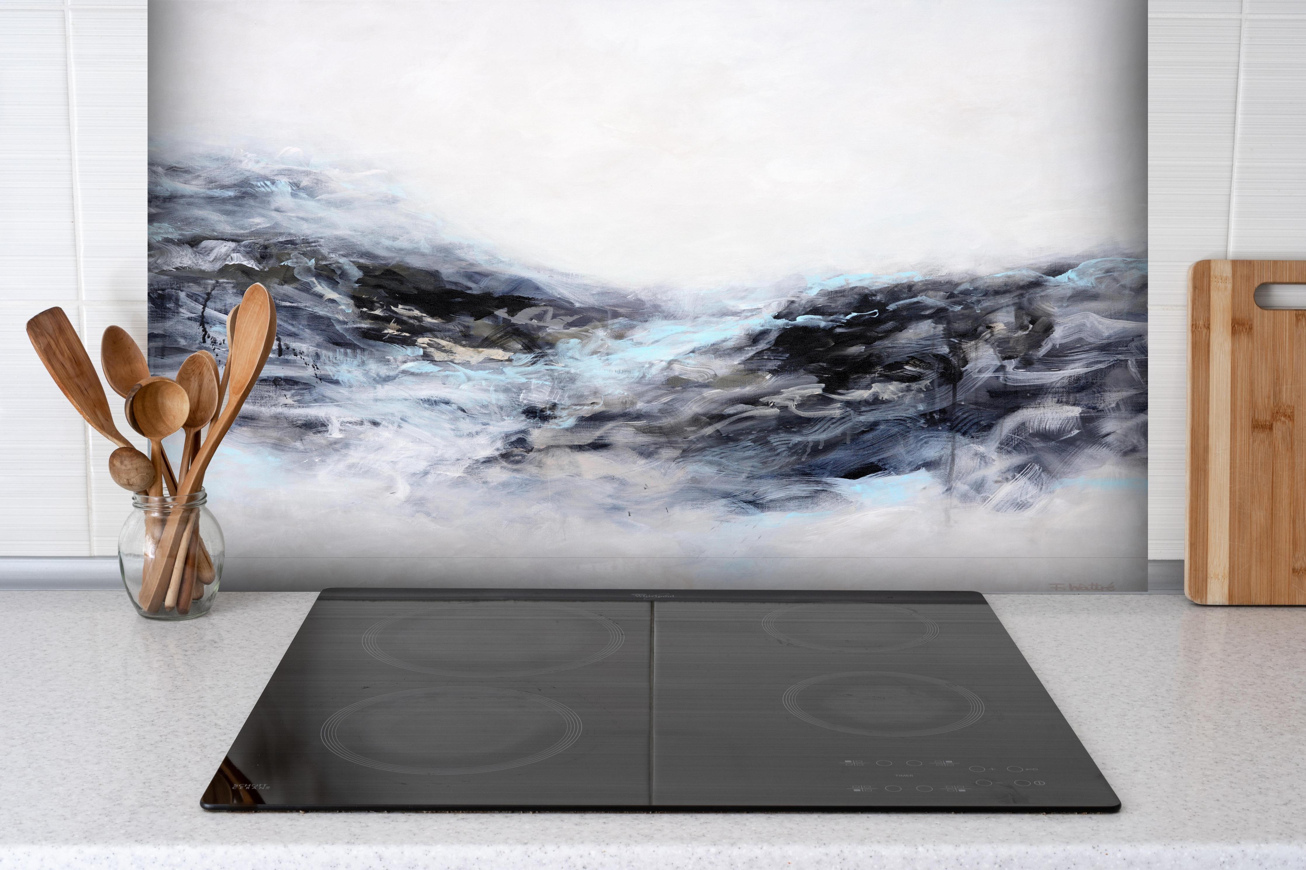 Spritzschutz-Entspannende Küstenlandschaft Modern AbstraktSpritzschutz - Entspannende Küstenlandschaft Modern Abstrakt hinter einem Cerankochfeld zwischen Holz-Kochutensilien