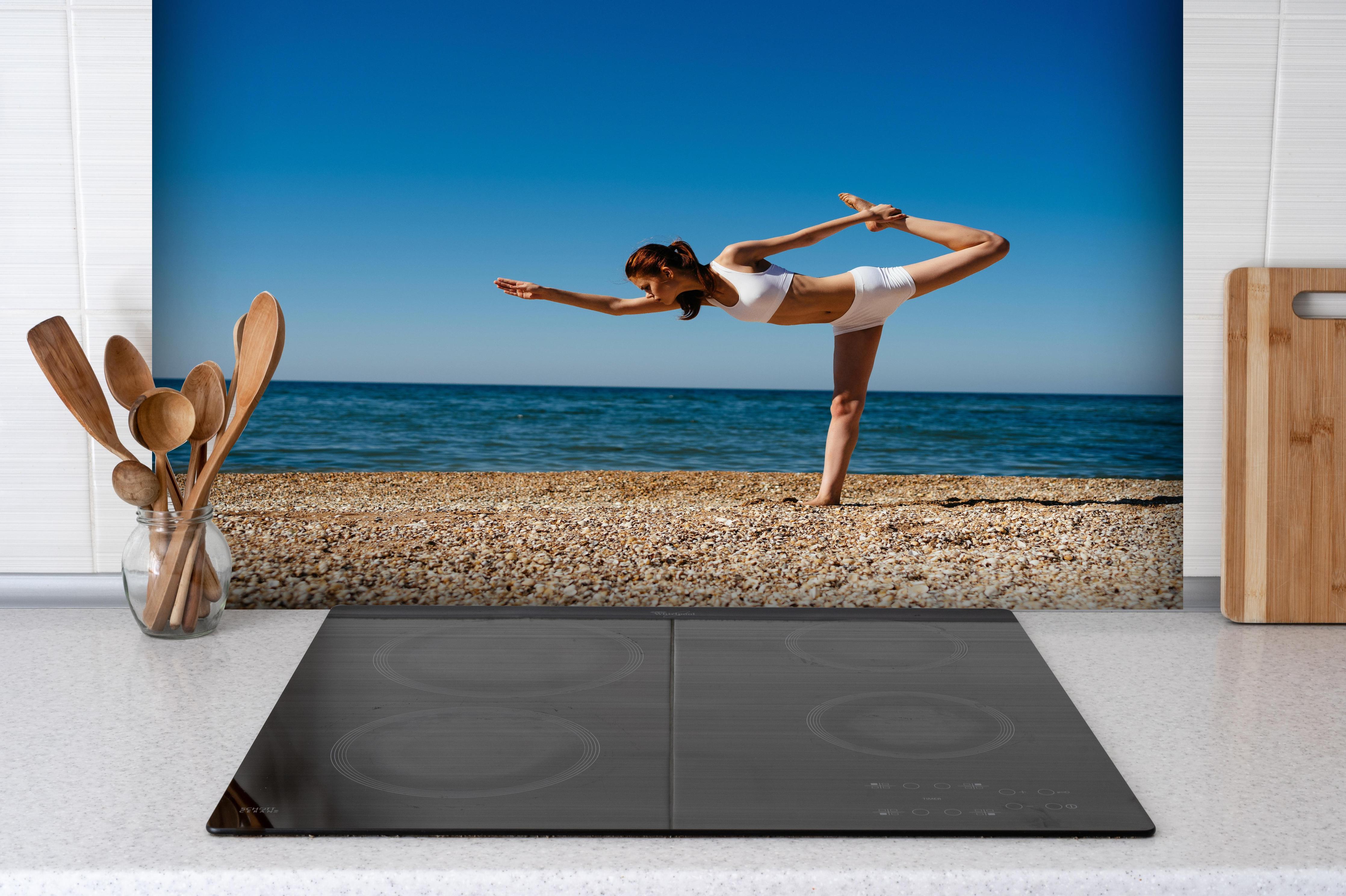 Spritzschutz-Frau im Badeanzug beim Yoga über MeereslandschaftSpritzschutz - Frau im Badeanzug beim Yoga über Meereslandschaft hinter einem Cerankochfeld zwischen Holz-Kochutensilien