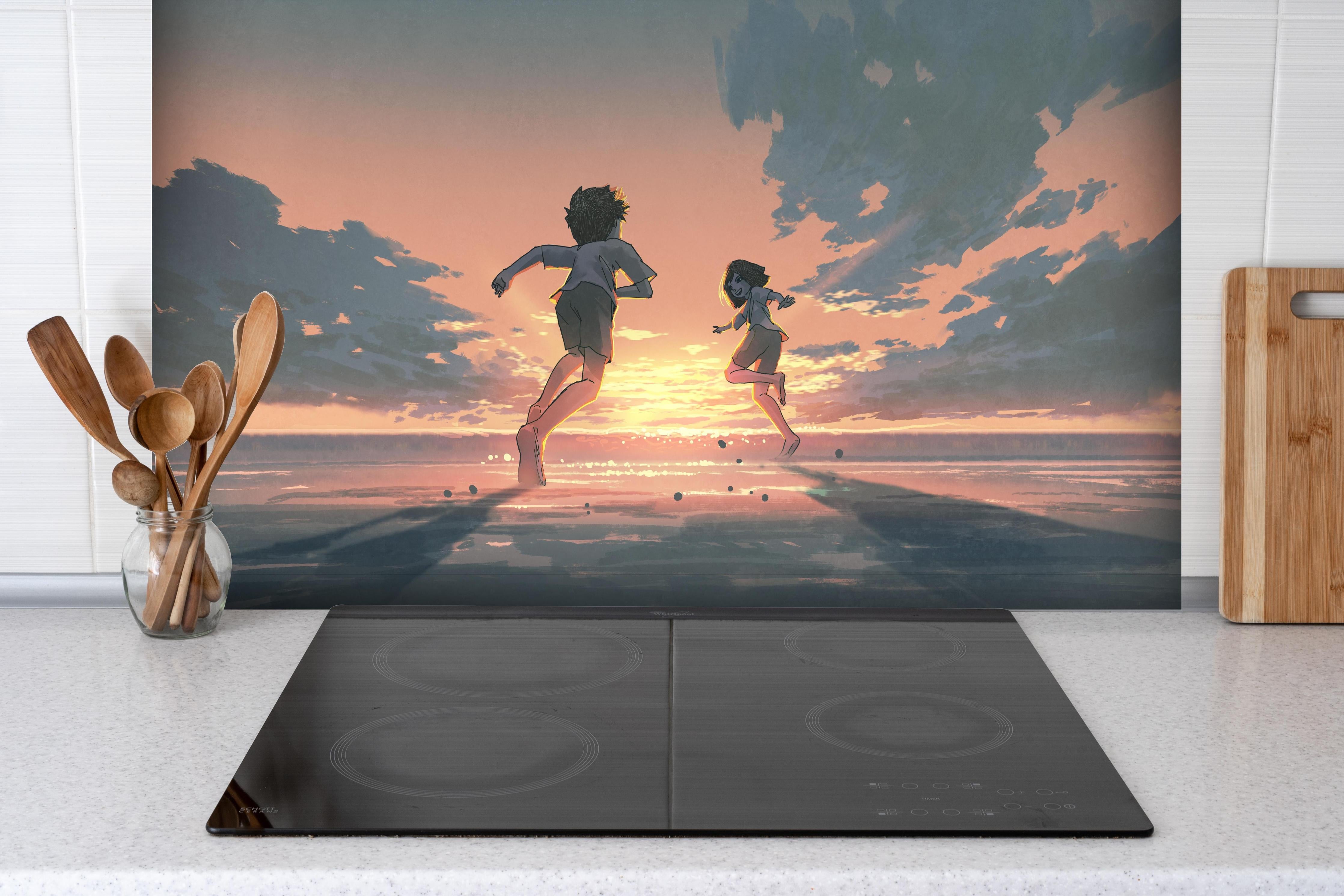 Spritzschutz-Kindheitserinnerung am Meeres-SonnenuntergangSpritzschutz - Kindheitserinnerung am Meeres-Sonnenuntergang hinter einem Cerankochfeld zwischen Holz-Kochutensilien