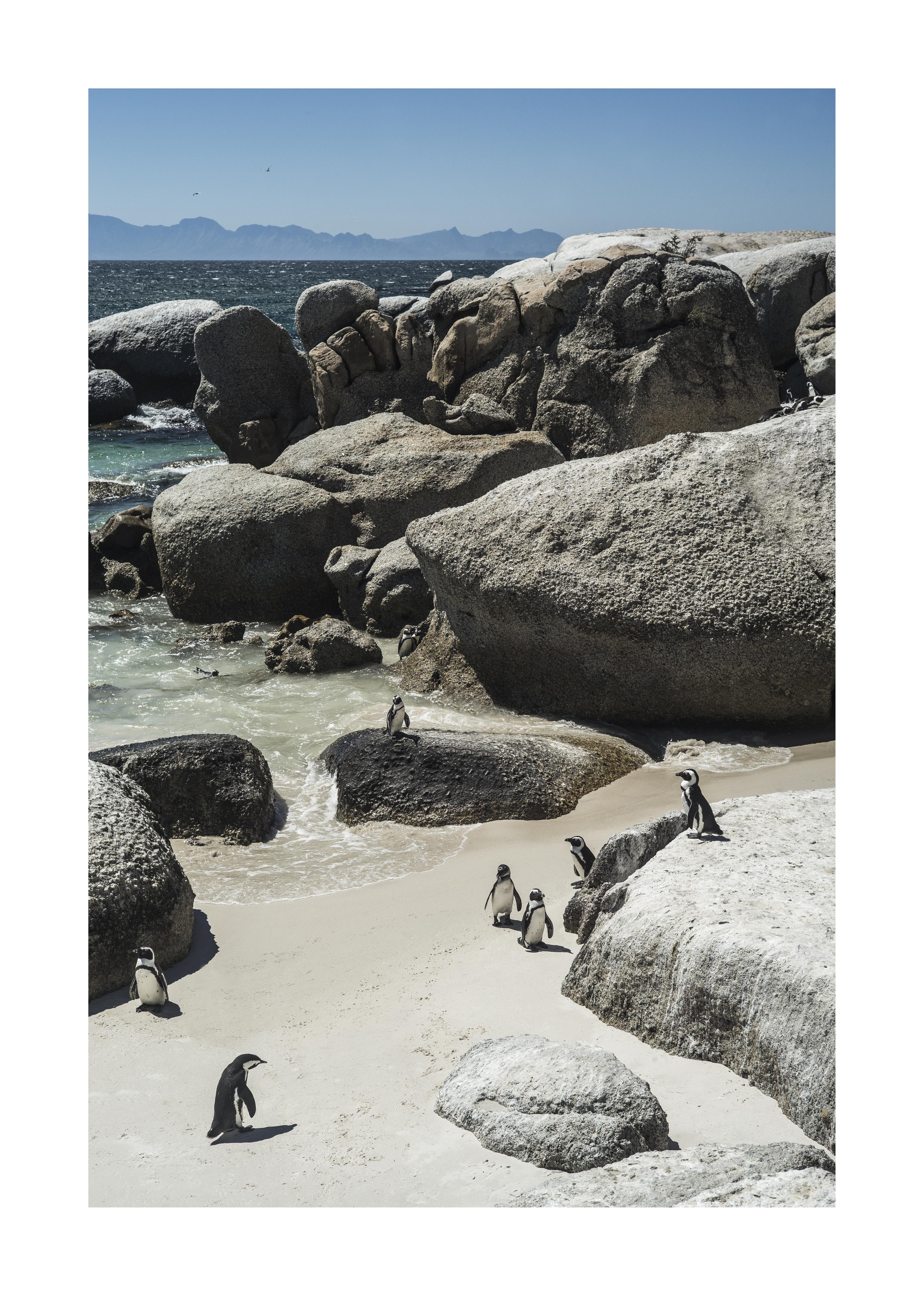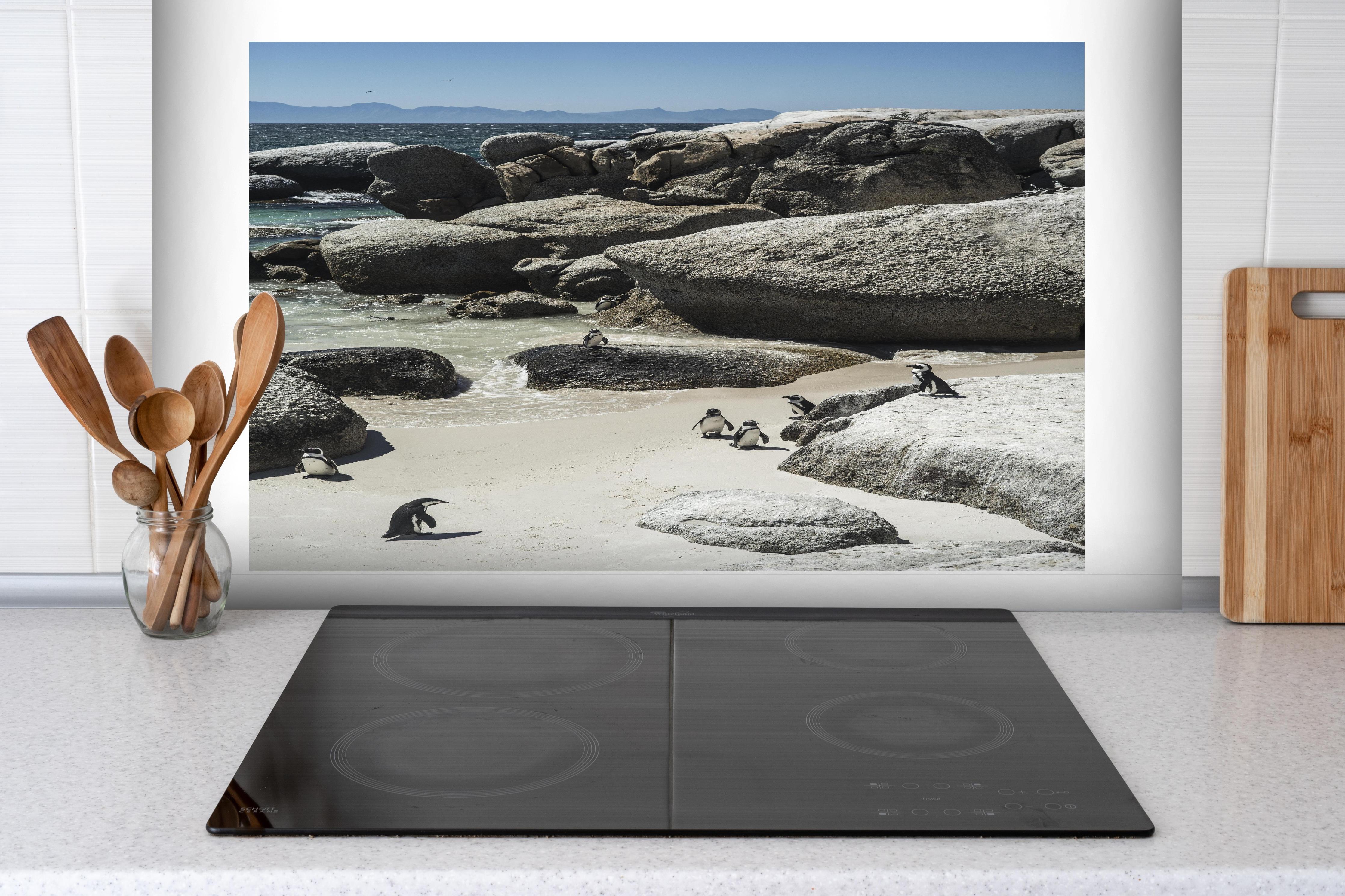 Spritzschutz-Pinguine auf Sandstrand mit FelsformationenSpritzschutz - Pinguine auf Sandstrand mit Felsformationen hinter einem Cerankochfeld zwischen Holz-Kochutensilien