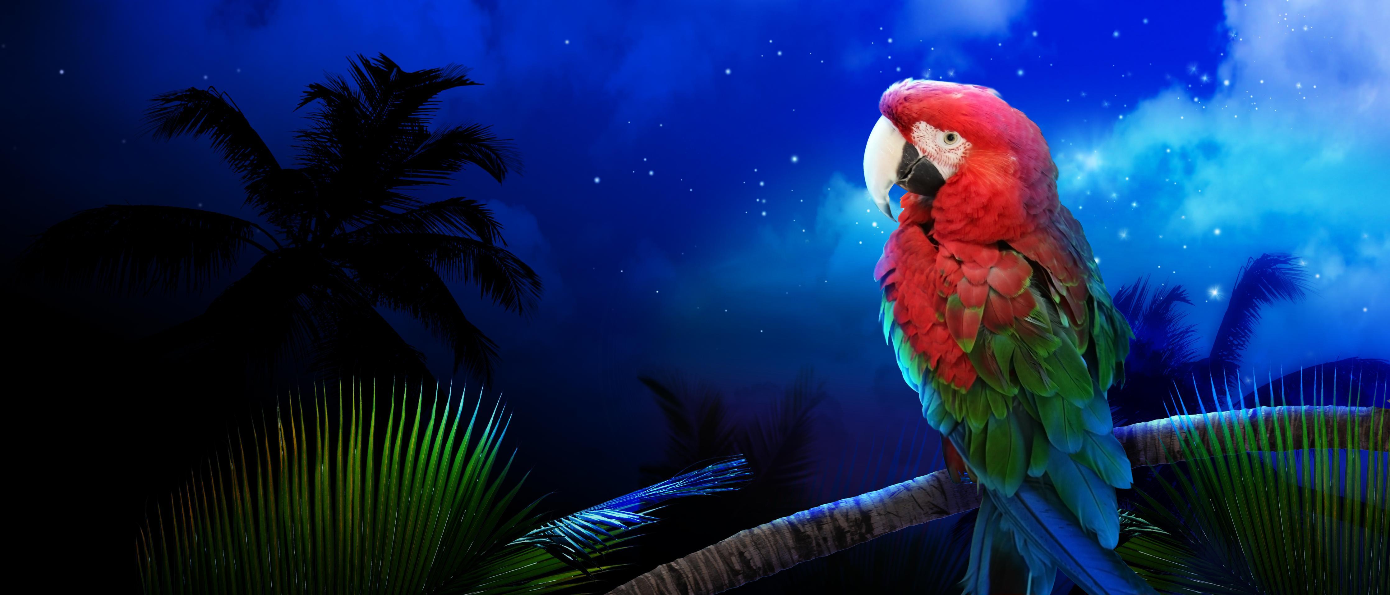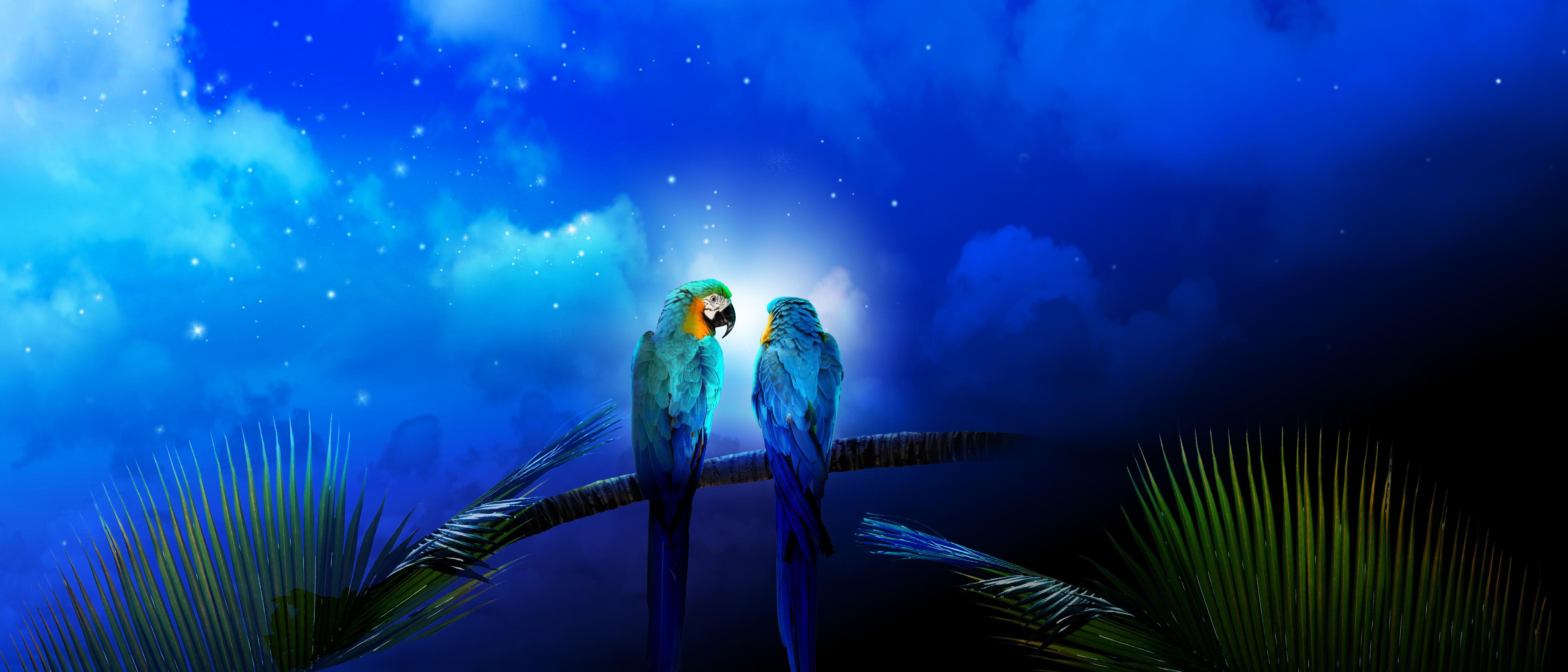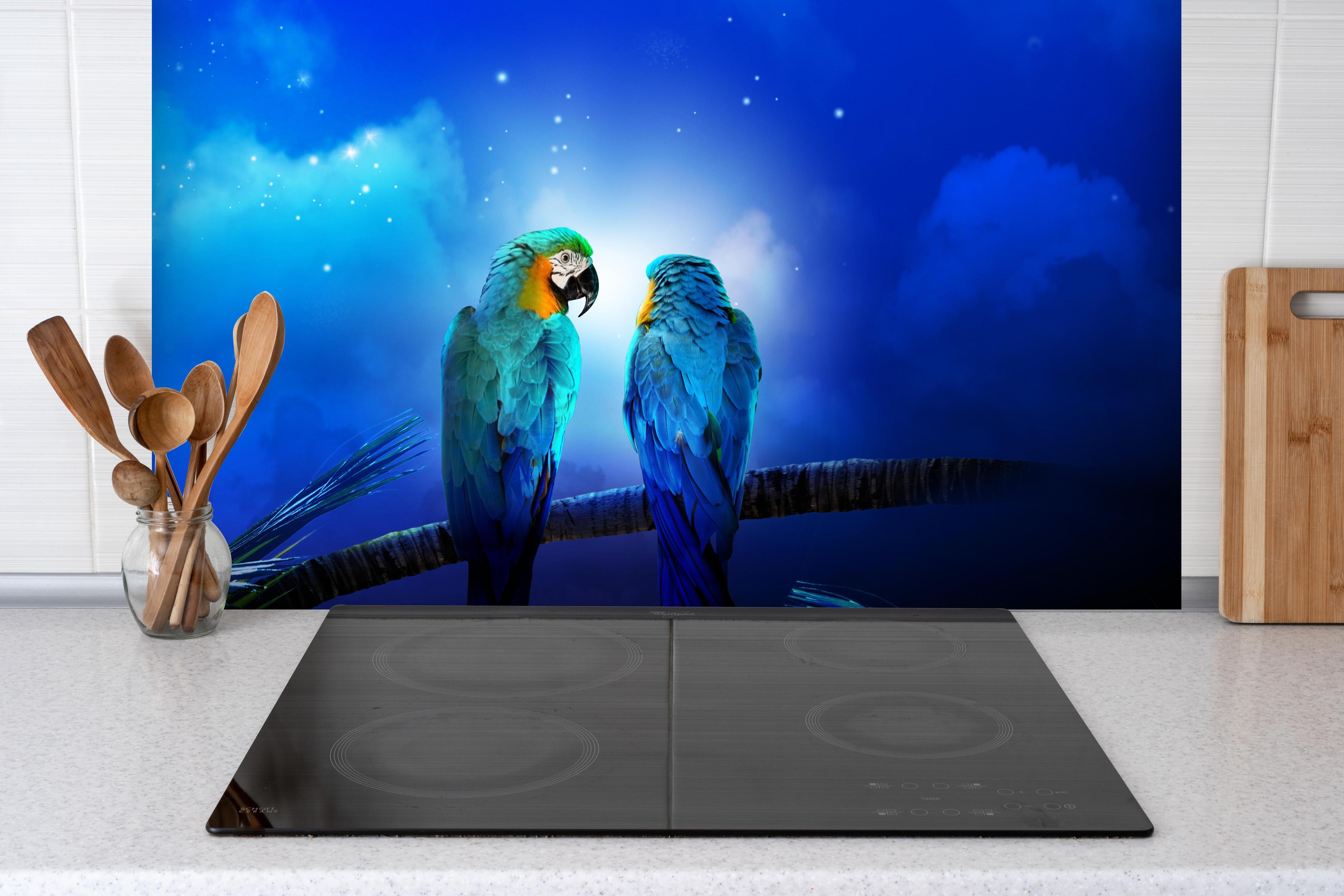 Spritzschutz-Zwei Papageien nachts am StrandSpritzschutz - Zwei Papageien nachts am Strand hinter einem Cerankochfeld zwischen Holz-Kochutensilien