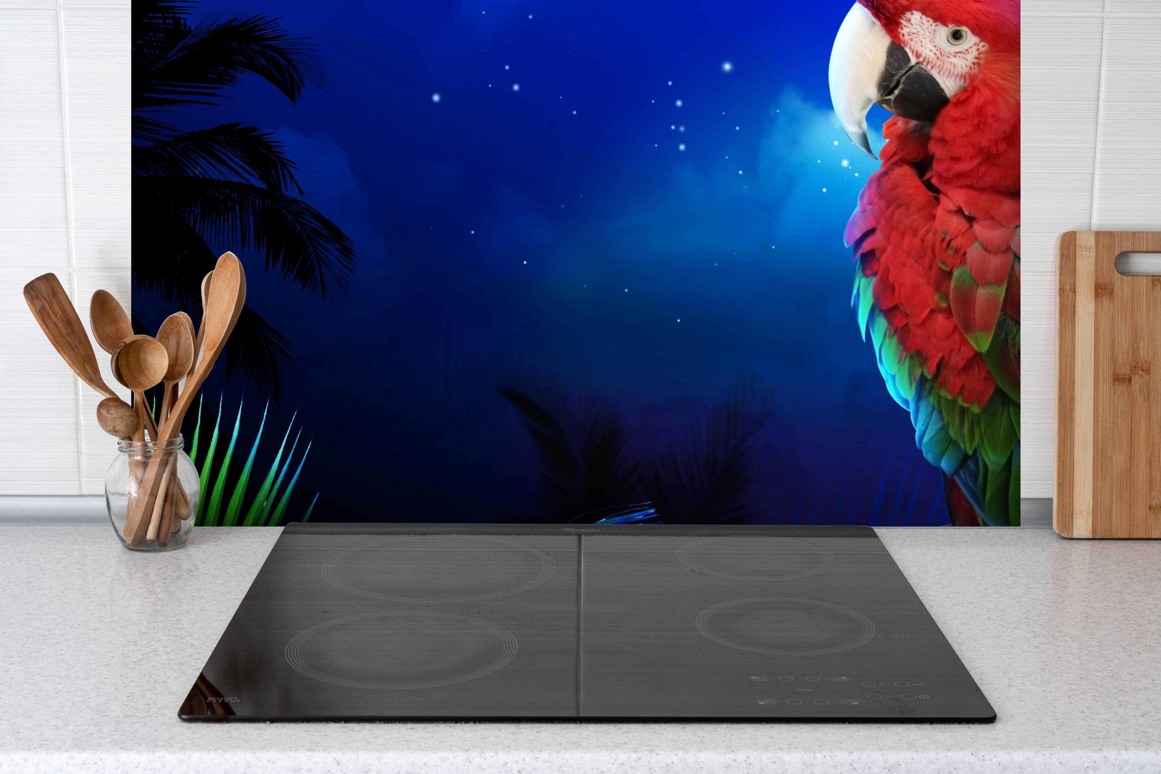 Spritzschutz-Papagei nachts am StrandSpritzschutz - Papagei nachts am Strand hinter einem Cerankochfeld zwischen Holz-Kochutensilien