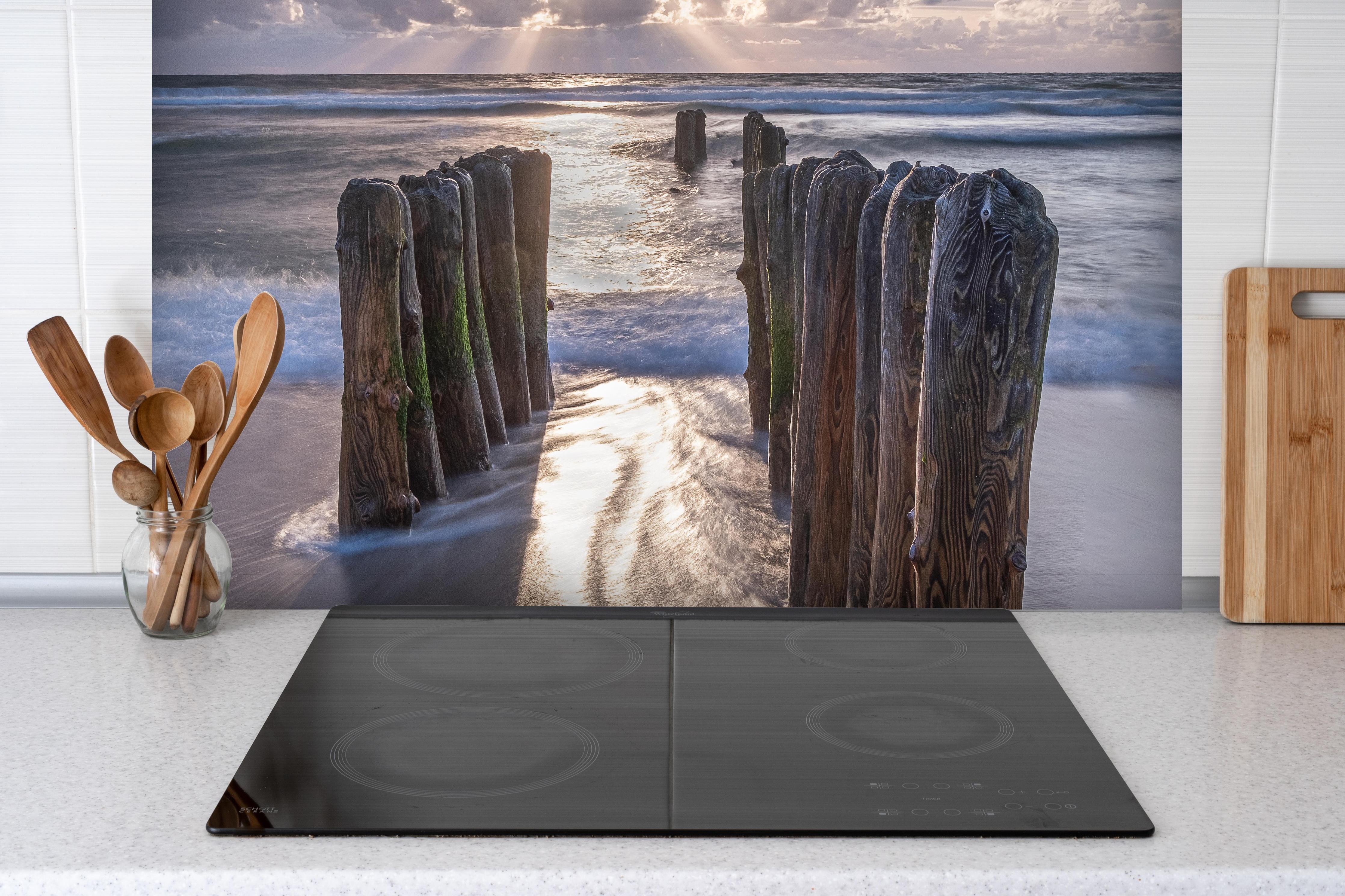 Spritzschutz-Wunderschöne Buhnen auf SyltSpritzschutz - Wunderschöne Buhnen auf Sylt hinter einem Cerankochfeld zwischen Holz-Kochutensilien
