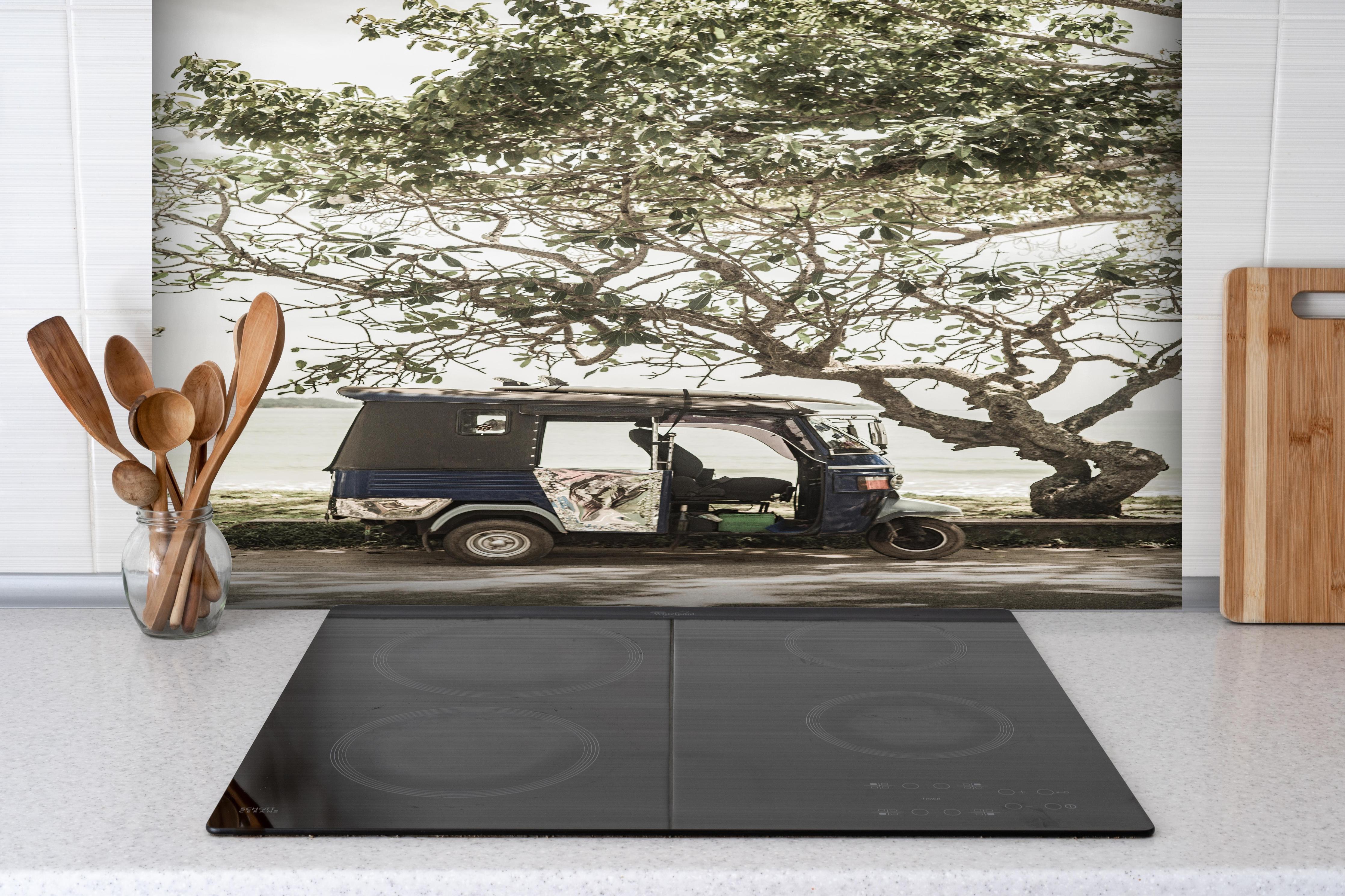 Spritzschutz-Tuk Tuk unter Bäumen am sonnigen StrandSpritzschutz - Tuk Tuk unter Bäumen am sonnigen Strand hinter einem Cerankochfeld zwischen Holz-Kochutensilien