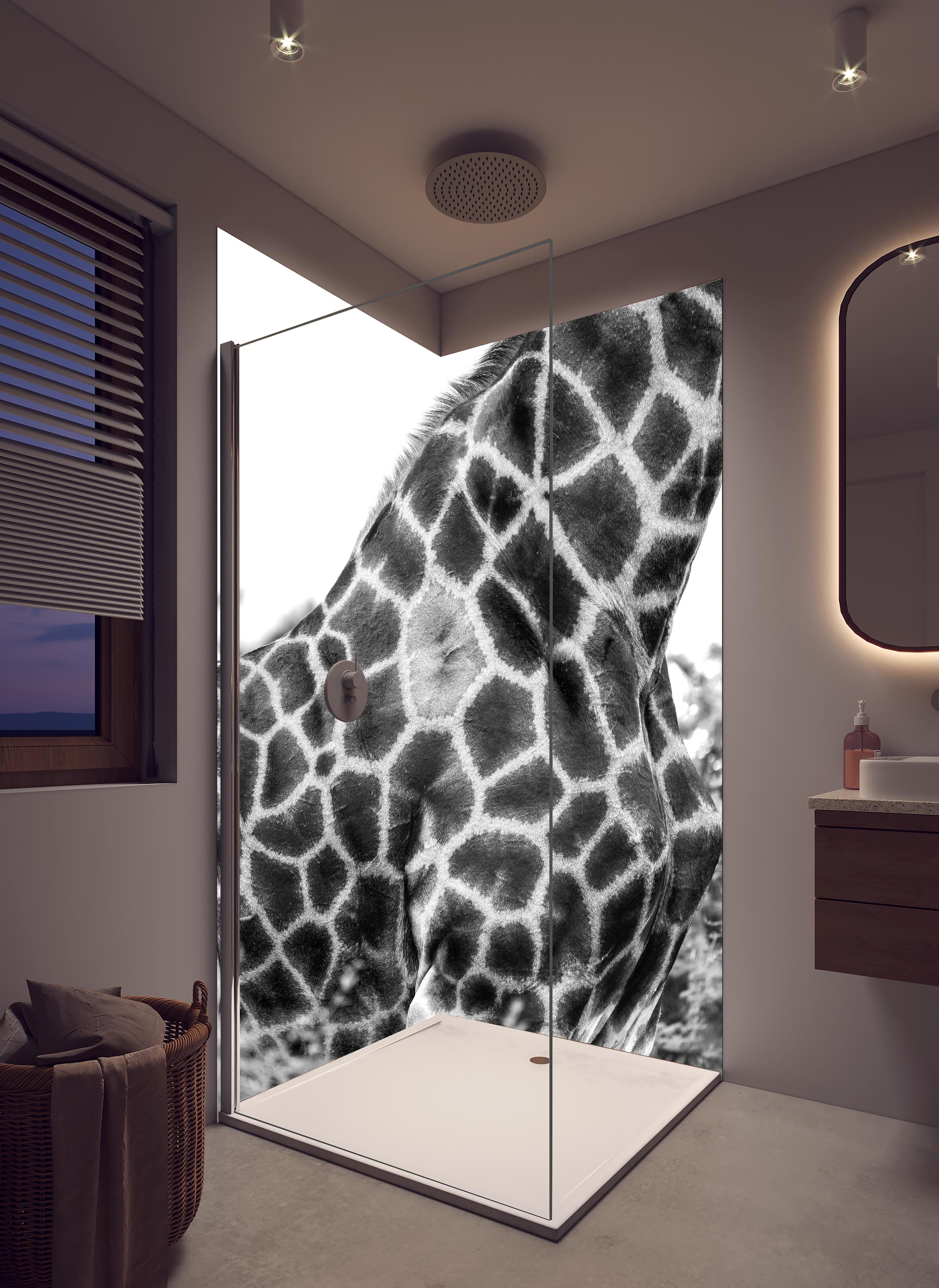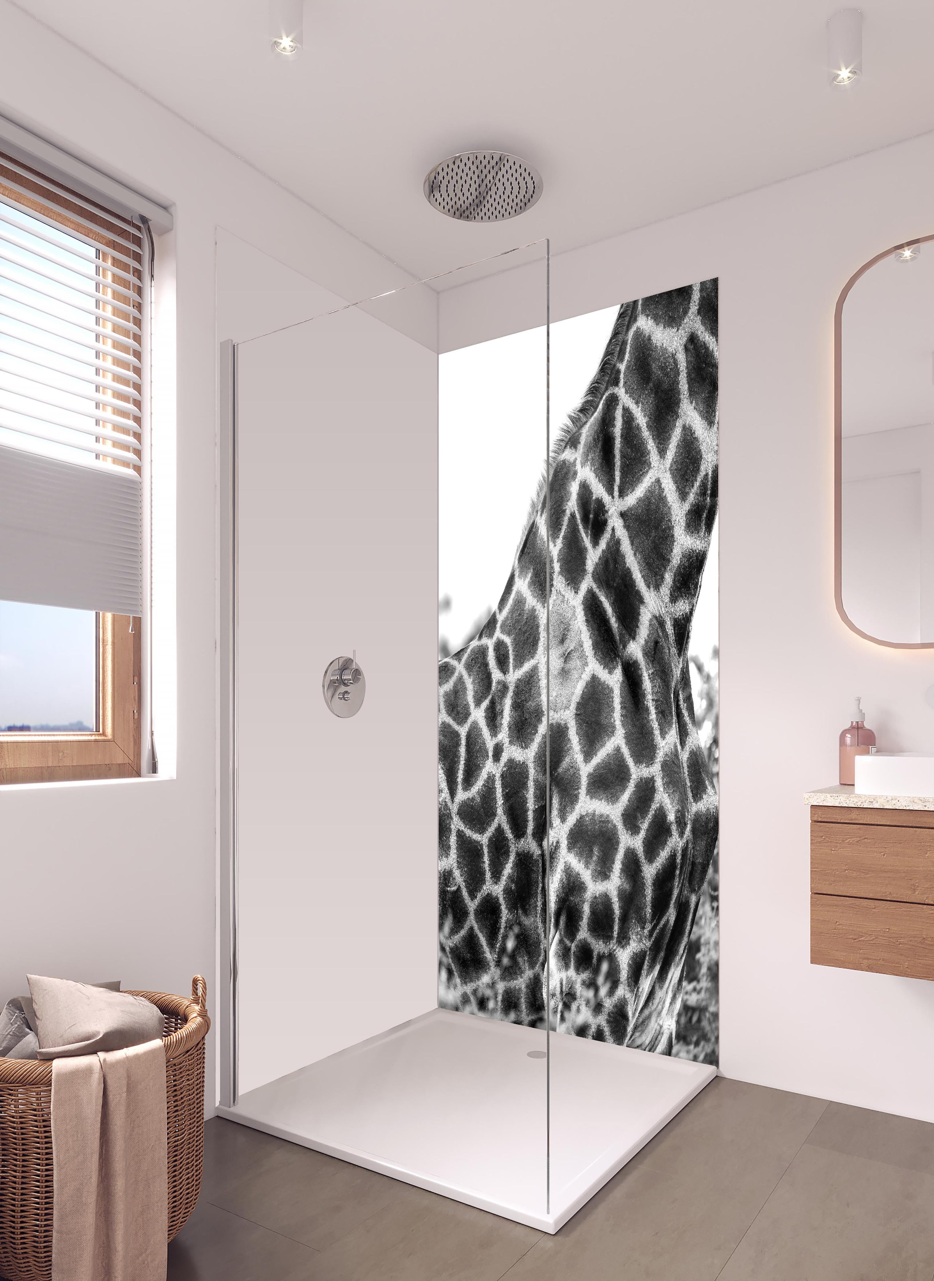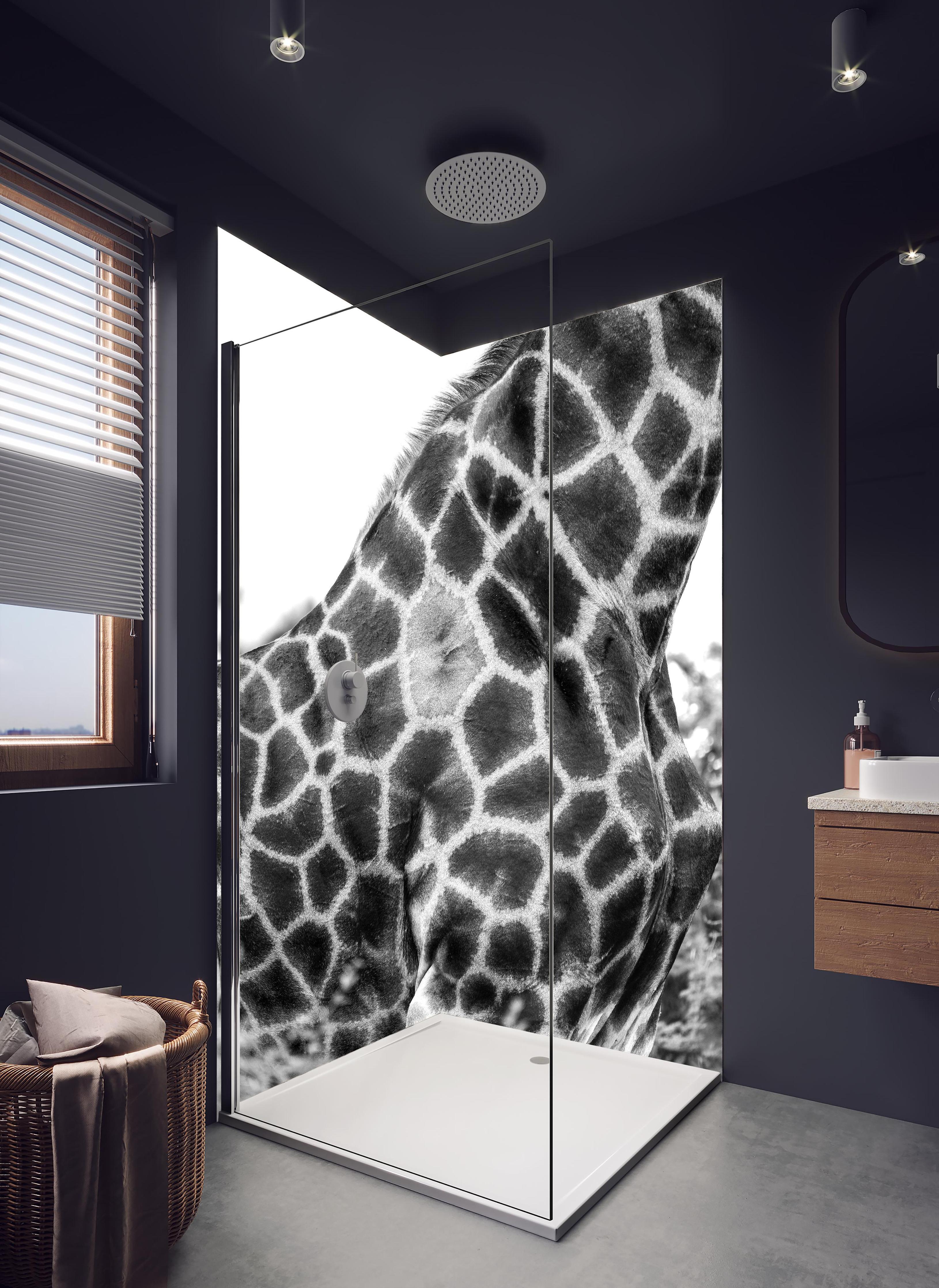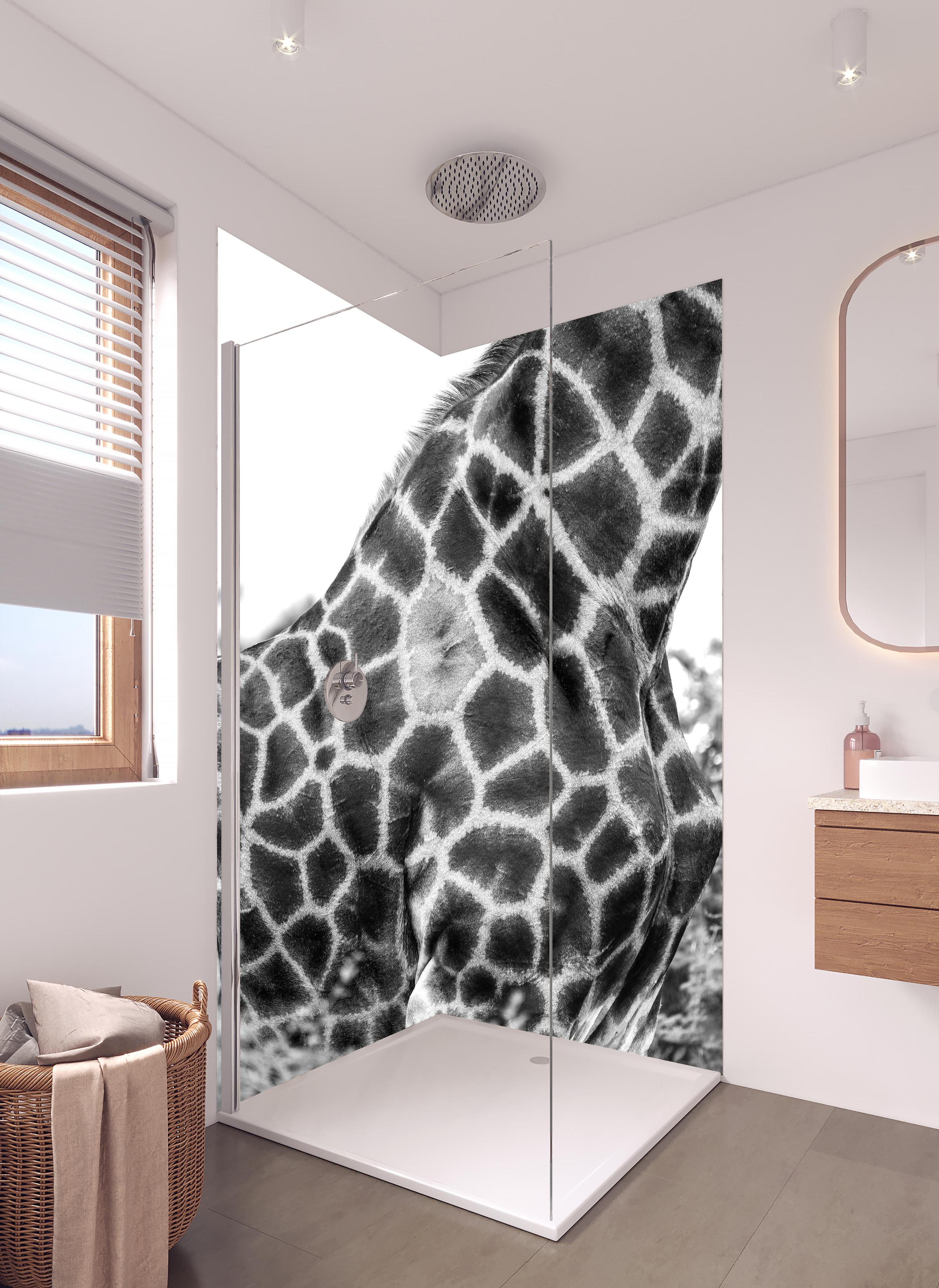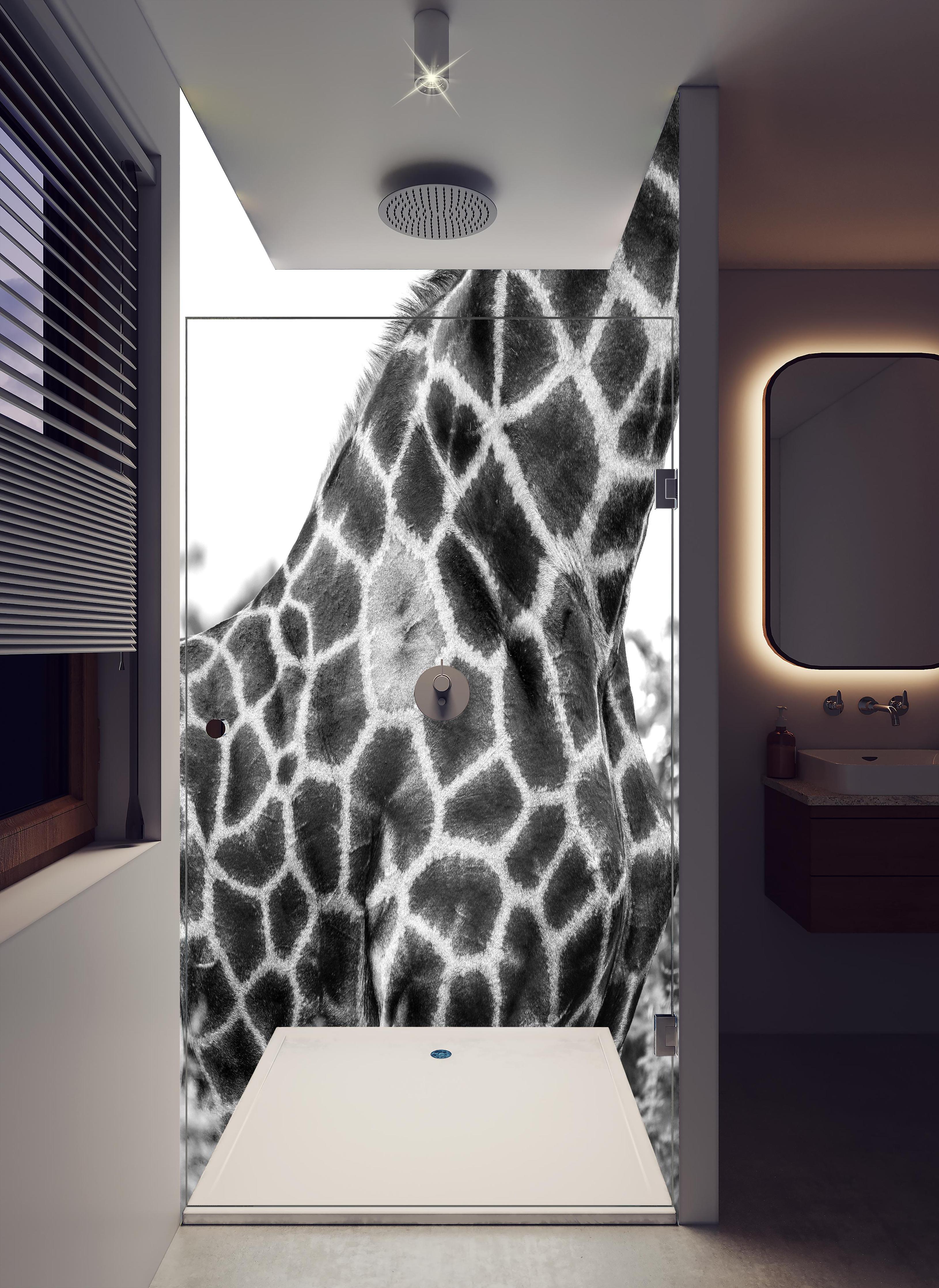 Mit der Duschrückwand ‚Giraffen Oberkörper‘ von Rückwand24 verleihst du Deinem Bad einen einzigartigen und unverkennbaren Look, der perfekt zu Dir passt. Passe das Motiv Duschrückwand ‚Giraffen Oberkörper‘ passgenau für Dein Bad an – einfach Maße eingeben und Motivausschnitt wählen – fertig. Wähle dabei zwischen unterschiedlichen Materialien wie ALU-Dibond, Super Solid Glass oder Acryl. Mit unserer exklusiven Prime Lotus-Shield Beschichtung veredelst Du Deine Duschrückwand zusätzlich.
