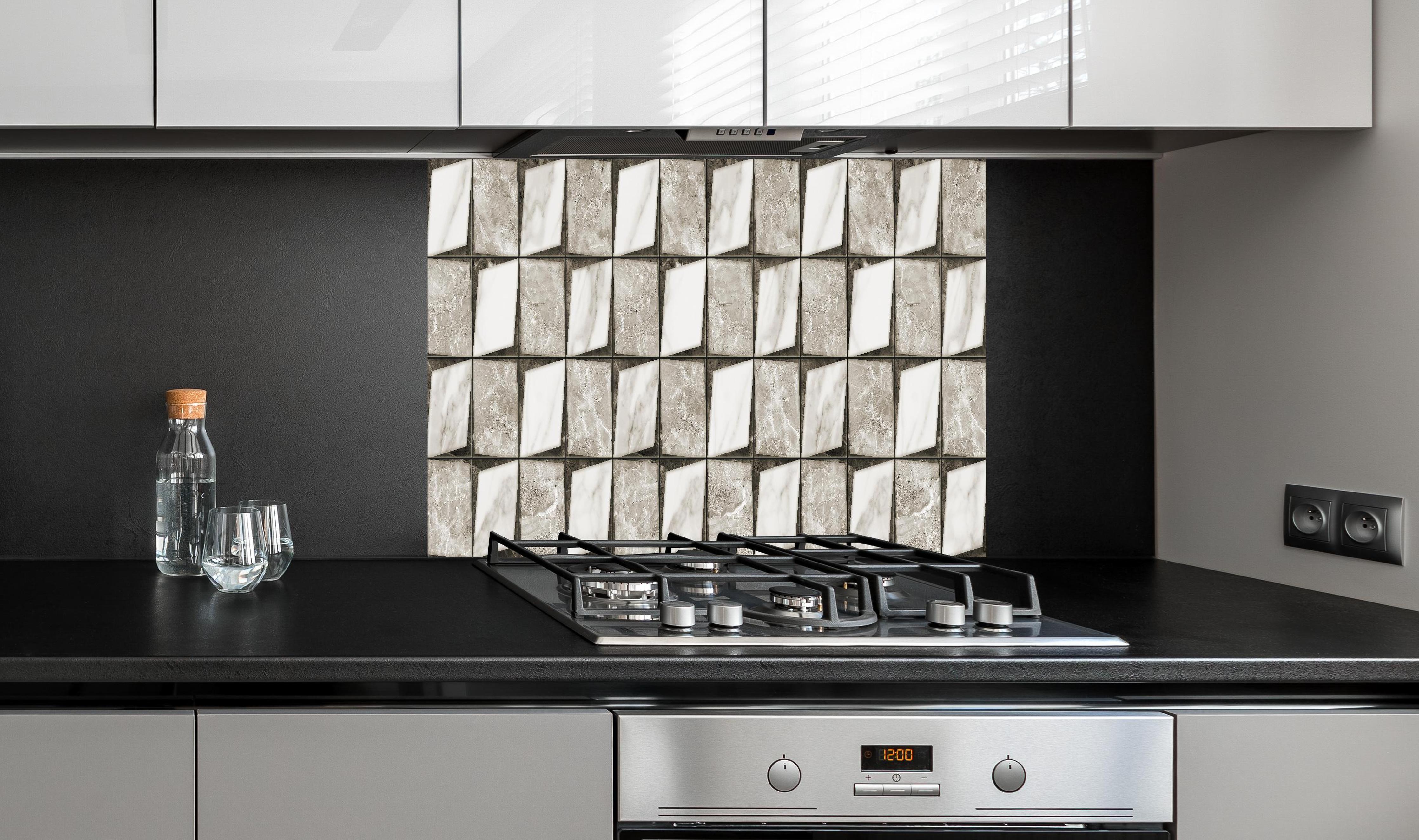 Mit dem Spritzschutz ‚Mosaik Fliesenmuster in Weiß und Grau‘ von Rückwand24 verleihst du Deiner Küche einen einzigartigen und unverkennbaren Look, der perfekt zu Dir passt. Passe das Motiv Spritzschutz - Mosaik Fliesenmuster in Weiß und Grau passgenau für Deine Küche an – einfach Maße eingeben und Motivausschnitt wählen – fertig. Wähle dabei zwischen unterschiedlichen Materialien wie ALU-Dibond, Super Solid Glass oder Acryl. Mit unserer exklusiven Prime Lotus-Shield Beschichtung veredelst Du Deine Küchenrückwand zusätzlich.